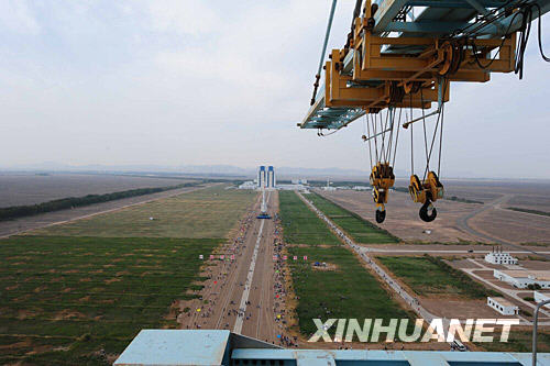 這是轉運現場。 9月20日15時15分,神七載人飛船、長征二號F運載火箭和逃逸塔組合體,順利垂直轉運至發射區,標志著神七任務已進入最后的發射準備階段。 新華社記者 李剛 攝