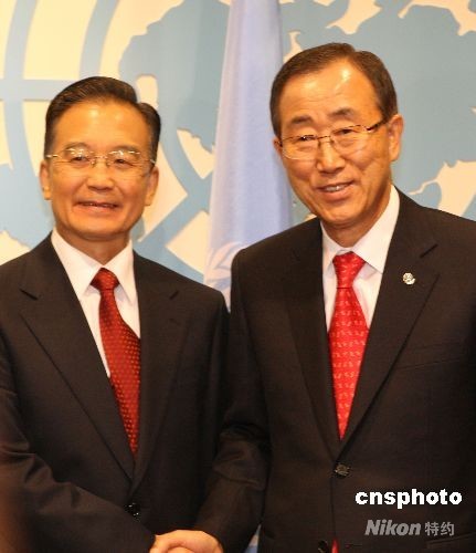 9月23日晚,中國總理溫家寶在紐約聯合國總部與聯合國秘書長潘基文舉行會晤。中新社發 李靜 攝