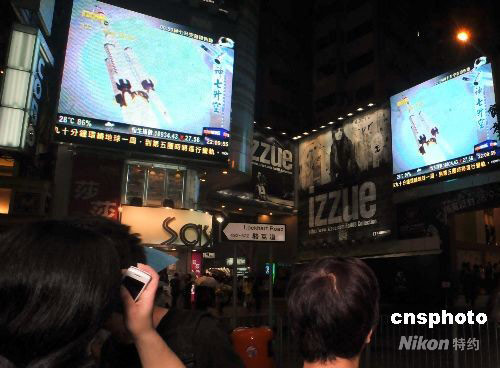 九月二十五日晚,中國載人太空船“神舟七號”在中國酒泉衛星發射中心順利升空。圖為“神舟七號”升空相關新聞片段在香港銅鑼灣鬧市播放,吸引市民駐足觀看。中新社發 鄧慶樂 攝