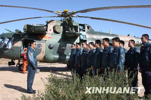 9月26日,在內(nèi)蒙古四子王旗神舟七號飛船主著陸場,空中搜救分隊的直升機轉(zhuǎn)場至回收任務(wù)待命區(qū)。這是陸航某團長、特級飛行員蔡有固在進行戰(zhàn)前動員。 新華社記者 王建民 攝