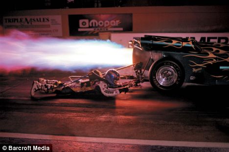 特技人阿托恩則向人們展示了他是如何在一輛1.4萬馬力、時速高達236英里的賽車后,靠抓住賽車尾部被拖拽了將近400米的勇氣。