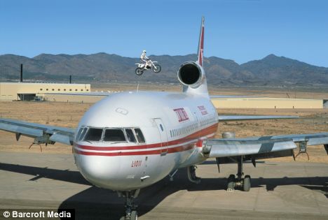 特技人道格駕駛一輛摩托車以時速每小時73英里的速度,精確地從一架翼展達48.8米的飛機上飛過,并成功地降落在一個長36.6米的斜坡上。
