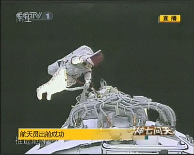9月27日,“神七”航天員翟志剛在艙外活動,展出五星紅旗。