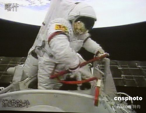 北京時間九月二十七日下午四點五十九分,神舟七號航天員翟志剛成功出艙,實現中國歷史上第一次太空行走。圖為翟志剛完成太空行走后準備從太空中返回軌道艙(攝于北京航天飛控中心大屏幕)。中新社發 齊彬 攝