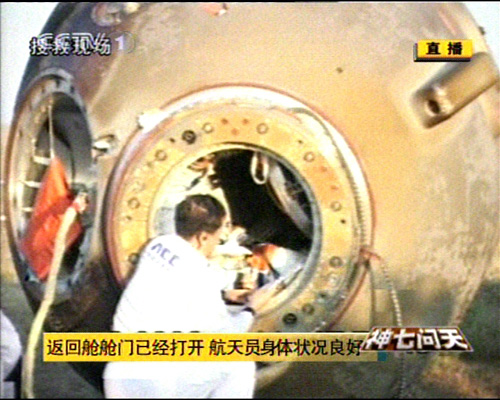 神舟七號飛船返回艙順利著陸,返回艙外觀檢查正常,搜救隊員按程序打開返回艙艙門,醫監醫保人員檢查航天員身體狀況。經醫監醫保人員檢查,三名航天員身體狀況良好。三人面帶笑容。