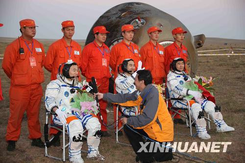 9月28日,神七航天員出艙后接受記者采訪。新華社記者王建民攝