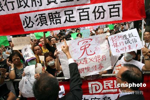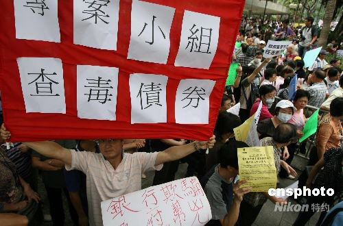 受雷曼迷你債券事件影響的香港市民,在香港立法會(huì)前請(qǐng)?jiān)浮V行律绨l(fā) 洪少葵 攝