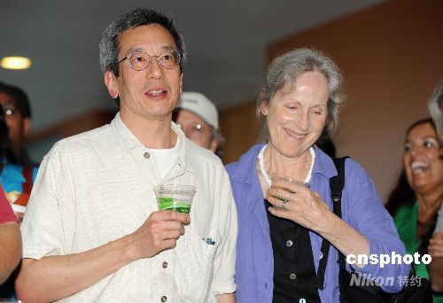 當?shù)貢r間10月8日下午,美國加州大學圣地亞哥分校醫(yī)學院和藥理學系,為剛剛榮獲諾貝爾化學獎的華裔科學家錢永健舉行慶祝會。錢永健和夫人溫迪,以及他的同事、學生等近百人出席。中新社發(fā) 張煒 攝