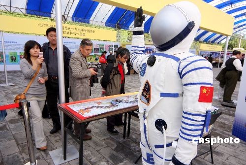 10月10日,“神七”模型和中國造“飛天”太空艙外航天服吸引眾多市民參觀拍照。當日,“太空禮贊·中國‘神舟’載人航天展覽”亮相北京地壇圖書節。據悉,按照1:5比例制作的‘神舟七號’飛船模型可謂是本次展覽的一大亮點,這也是該模型首次在公眾面前展示,同類模型目前只在北京航天飛行控制中心內有一個。中新社發 吳芒子 攝