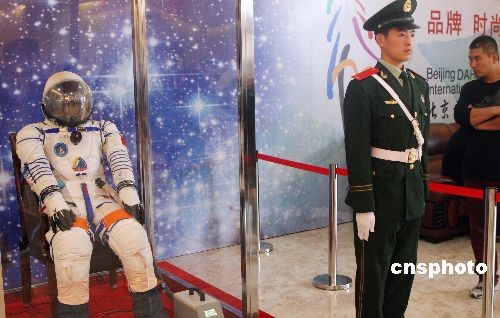 10月16日,2008北京大紅門國際服裝節暨文化創意論壇在北京開幕,服裝節圍繞“品牌、時尚、活力”主題,利用多載體、多形式、多角度開展系列活動。圖為在北京大紅門國際服裝節開幕式上展示中國“神七”艙內航天服。中新社發 錢興強 攝