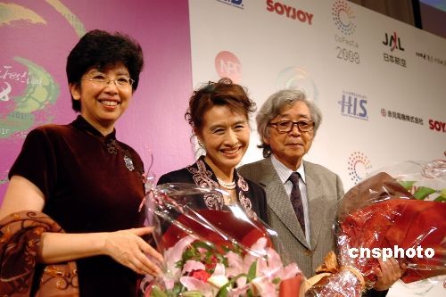 圖為在晚上舉行的開幕酒會上,中國廣電總局副局長趙實向日本著名導演山田洋次(右)、著名演員栗原小卷(中)頒發“中日文化交流促進獎”,以感謝他們多年來為中日文化交流所作出的巨大貢獻。中新社發 朱沿華 攝