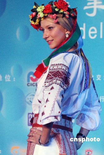 10月23日晚,在北京舉行的2008新絲路世界模特大賽上,各國參賽選手進行才藝展示。圖為參賽選手展示民族服裝。中新社發 錢興強 攝