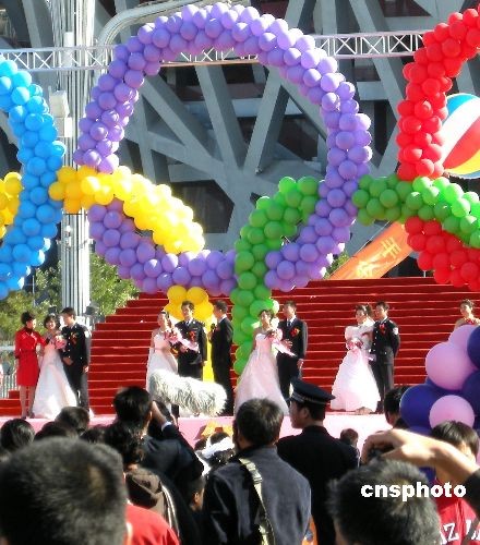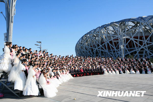新人在鳥(niǎo)巢前合影。新華社記者羅曉光 攝(圖片來(lái)源:新華網(wǎng))