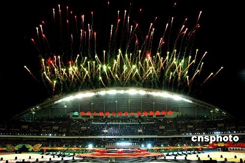 燦爛的煙花點亮體育中心。中新社發 鄭祚聲 攝