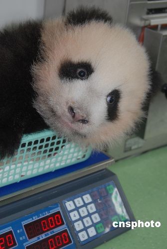 圖為大熊貓幼仔平平(雌性)在稱(chēng)體重。中新社發(fā) 羅小韻 攝
