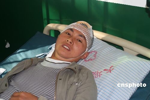 江西省宜春市銅鼓縣大塅鎮村民與當地綠海木業有限公司日前發生的一起沖突事件目前已平息。該事件造成十幾名村民受傷,三名警員受傷,除一名被擊中胸部的警察傷勢嚴重仍在全力救治外,其余傷員病情穩定。圖為二十七日一名頭部受傷的村民正在當地醫院接受治療。中新社發 艾永全 攝