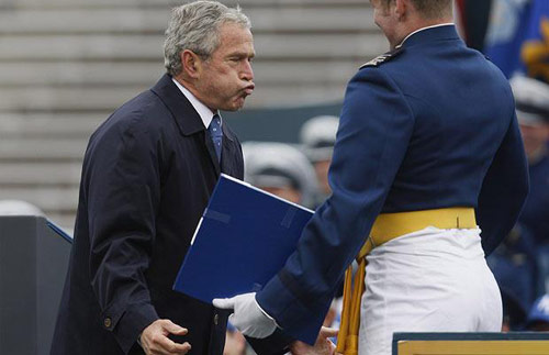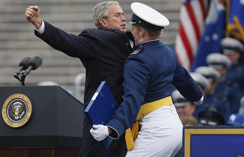 2008年5月28日,美國總統布什在科羅拉多州出席空軍學院畢業典禮。在典禮上,布什除了按照一般程序發表講話外,還與畢業生們玩起撞胸的角力游戲,給畢業生演示舞蹈動作,活潑可愛,顯示出了老頑童的本色。