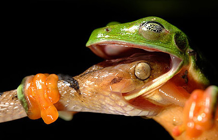 一只樹蛙(北美洲樹蟾科)與一條蛇進行生死決斗。