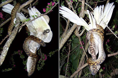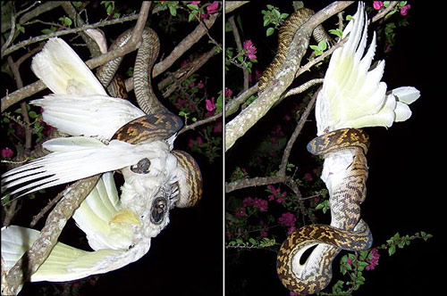 蟒蛇行動遲緩,一般很難捕捉到鳥類等動物。但是日前英國一名女子卻拍攝到了一條蟒蛇吞吃一只美冠鸚鵡的全過程。