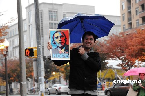 華盛頓街頭一位奧巴馬支持者舉著寫有“希望”字樣的奧巴馬像,號召人們抓緊時間“顆粒歸倉”,把奧巴馬送到白宮。中新社發(fā) 邱江波 攝