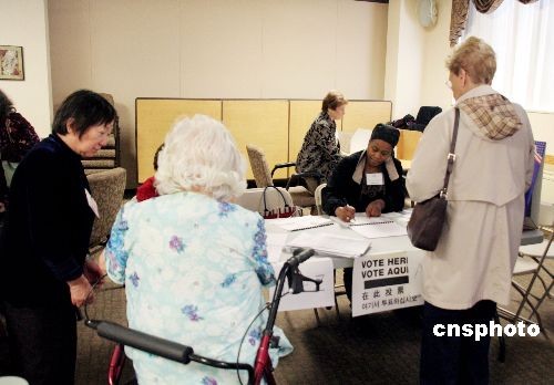 美國東部時間4日,美國總統選舉投票開始.在紐約新華裔移民聚居地法拉盛地區投票點,不僅有中文“在此投票”的說明,更配有專職中文翻譯,可幫助講廣東話、福州話乃至上海話的居民順利投票。中新社發 魏晞 攝