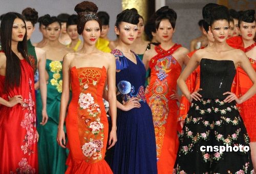 11月5日晚,北京舉行的中國國際時裝周(2009春夏系列發布),上演了一場華服大典!皣煜 華服大典”以緙絲傳承歷史,以牡丹展現盛世繁華,續寫中國奢侈品文明復興的傳奇。圖為模特展示2009華服大典作品。中新社發 錢興強 攝