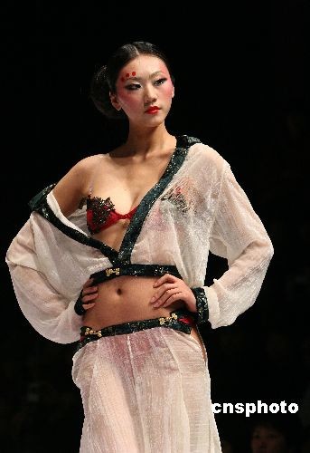 2008年11月5日,中國國際時裝周(2009春夏系列發布)開幕式——2008中華內衣元素創新設計大賽在北京舉行。 本次大賽共收到全國27個地區(包括港澳臺)和英國、日本的872組參賽作品,經過評委的認真評選,來自中國內地、中國臺灣、英國和日本的24組參賽作品入圍。來自不同國家和地區的選手們從各個角度對漢代文化進行各自的詮釋,將漢代文化的多元與繁榮表現地淋漓盡致。中新社發 魯谷 攝