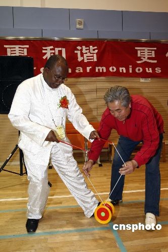 11月11日,非洲友好城市官員研修班學員和部分非洲國家駐華使節及家屬,在北京東四奧林匹克社區和居民一起聯歡互動,體驗北京百姓生活。中新社發 杜洋 攝