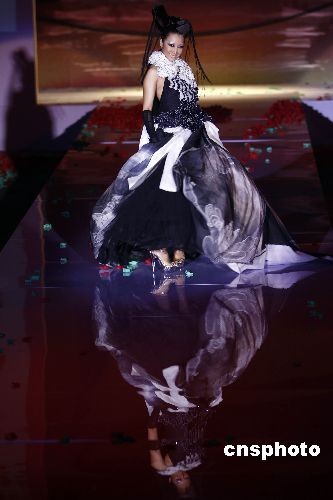 11月11日,一場(chǎng)設(shè)計(jì)主題是“天色”的高級(jí)時(shí)裝發(fā)布會(huì)于2008中國國際時(shí)裝周(2009春夏系列發(fā)布)期間在北京飯店舉行,強(qiáng)烈的視覺沖擊和舞臺(tái)效果為觀眾帶來一場(chǎng)視覺盛宴。中新社發(fā) 盛佳鵬 攝