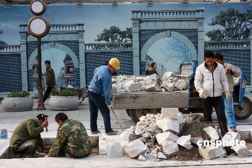11月14日, 北京前門大街南段,長50米、寬10余米的路段用警戒線圍了起來,施工人員正在對路面及其它設施進行維修保養。屆時,備受關注的前門大街“鐺鐺車”也已清洗一新,即將載客運行,那“鐺鐺”的聲音時隔42年后將再次回到前門大街。8月7日開街以來,前門大街已接待1000多萬的游客,這是開街3個多月來第一次路面保養。中新社發 鄭雄增 攝