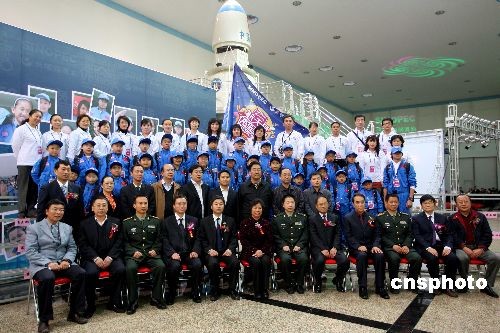 中國航天員楊利偉、費俊龍、聶海勝出席開營儀式與營員合影。中新社發 盛佳鵬 攝