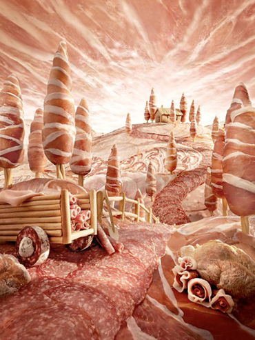 托斯卡納風(fēng)景是由面包棒打造的小屋、手推車(chē)和巖石,意大利冷肉用于裝扮天空、樹(shù)木和山丘。