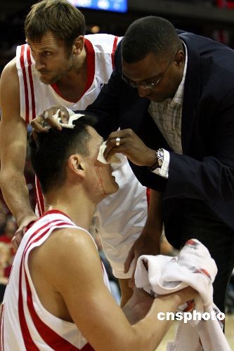 當(dāng)?shù)貢r(shí)間26日晚,回到主場(chǎng)作戰(zhàn)的火箭隊(duì)一分之差被對(duì)手逆轉(zhuǎn),以90-91遺憾地?cái)〗o步行者。姚明首節(jié)右眉骨受傷,不過還是堅(jiān)持出戰(zhàn),拿下了19分10個(gè)籃板。中新社發(fā) 歐文 攝