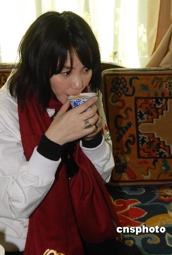 11月28日下午,王菲、李亞鵬在西藏自治區(qū)紅十字會領導陪同下,來到拉薩城關區(qū)當巴居委會,看望一歲的唇腭裂患兒小央金,并為小央金送去慰問金和禮物。首次做客藏家的王菲、李亞鵬夫婦顯得很愉快,并不時招呼現(xiàn)場記者一同品嘗具有西藏特色的綠色食品炒青稞。期間,李亞鵬在主人招呼下品嘗了西藏的青稞酒,而王菲則學喝了獨具西藏口味的酥油茶。中新社發(fā) 龍昊 攝