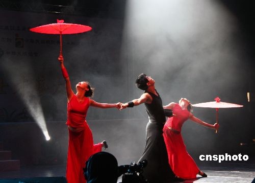 上海殘疾人藝術(shù)團的聾人舞蹈演員在晚會上表演舞蹈《紅黑傘》。中新社發(fā) 周兆軍 攝
