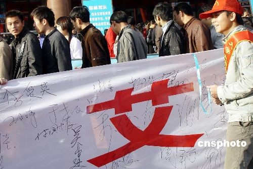 鄭州火車站過往旅客走過防“艾”簽名條幅。中新社發 李志全 攝