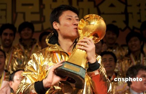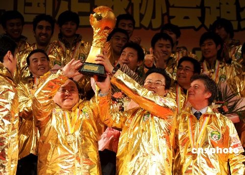 12月4日,2008中國足球協(xié)會超級聯賽頒獎典禮在山東濟南舉行。冠軍球隊山東魯能泰山全體將士登臺舉起火神杯。