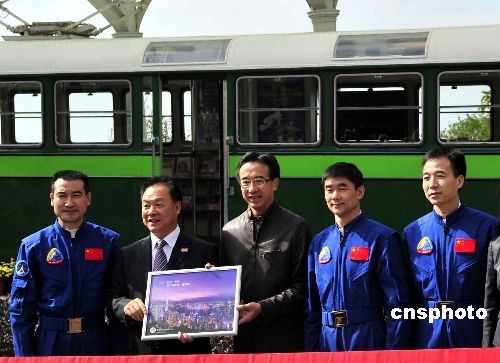 “神七”訪港代表團向香港旅發局主席田北俊(中)贈送紀念品。中新社發 譚達明 攝