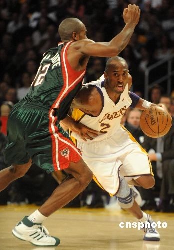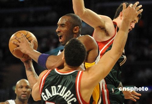 當地時間十二月七日晚,NBA洛杉磯湖人隊在主場以一百零五比九十二輕取雄鹿隊。其中湖人后衛科比·布萊恩特上場三十一分鐘,奪得二十分。中新社發 張煒 攝