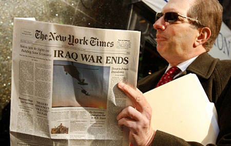 紐約一名讀者正在閱讀一份假的《紐約時報》,報紙的頭版頭條竟然是伊拉克戰(zhàn)爭結(jié)束。盡管報頭、字體、字型都達到了以假亂真的程度,但它仍然是“贗品”,這份由專門戲弄名人和名組織機構(gòu)的“應(yīng)聲蟲”組織偽造的《紐約時報》上標(biāo)明的發(fā)行日期是2009年7月4日,據(jù)稱,他們是希望通過此舉達到鞭策新當(dāng)選總統(tǒng)奧巴馬恪守承諾的目的。