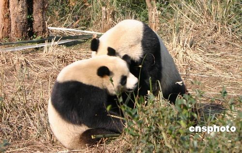 贈臺大熊貓“團團”“圓圓”經過長期同居生活更顯恩愛,經歷了地震后感情也更加如膠似漆,誰也離不開誰。圖為11日“小兩口”竊竊耳語,大秀恩愛。中新社發 霍潺 攝