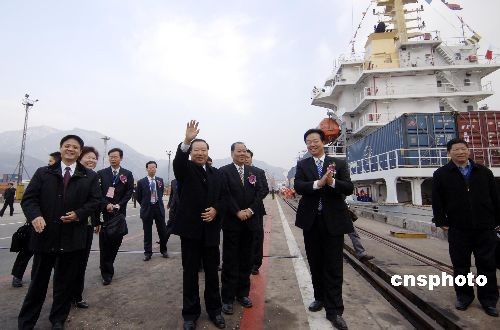海峽兩岸關系協會副會長王在希以及福建省相關領導在福州青洲港區揮手送別承擔兩岸海上直航首航任務的船員。