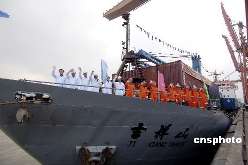 承擔閩臺海上貨運直航首航任務的“吉祥山”號船員與送行人員揮手告別。中新社發 王東明 攝