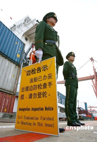 邊防戰(zhàn)士為首航船舶辦妥出境邊防檢查手續(xù),守護在碼頭。
