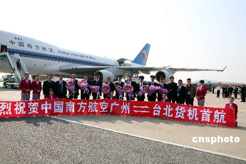 由中國南方航空股份有限公司執飛的兩岸首架直航貨運包機,于十二月十五日下午十五時從廣州白云國際機場起飛,預計飛行一小時四十五分鐘后降落臺北桃園機場。 該架貨機型為目前世界上最先進、最大型的波音七四七-四零零F全貨機。中新社發 羅廣泰 攝