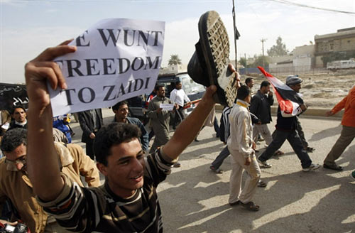 14日,伊拉克記者扎伊迪在招待會(huì)上向布什扔出自己的鞋子,并高聲辱罵布什。憑借此舉扎伊迪一夜成名,成為整個(gè)阿拉伯世界的“斗士”。