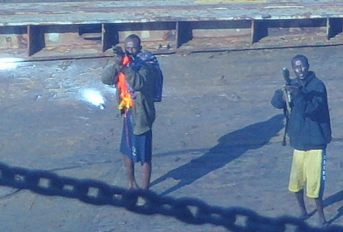 2艘小艇利用航速20多節的優勢,已經靠上了“振華4號”,左側船頭,荷槍實彈的海盜真的爬上了船。