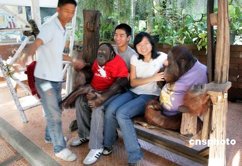 十二月中旬,中國游客在泰國是拉差龍虎園與大猩猩快樂合影。隨著泰國局勢的逐漸穩定,外地游客陸續而至。中新社發 洪少葵 攝