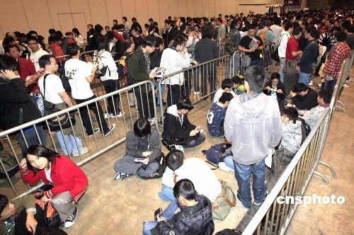 十二月十九日,一年一度的“亞洲游戲展2008”在香港會(huì)展中心舉行。圖為游戲迷們?cè)缭鐏?lái)到門口排隊(duì)等候進(jìn)場(chǎng)。中新社發(fā) 張勤 攝