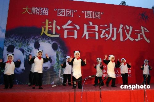 12月23日是贈臺大熊貓“團團”、“圓圓”飛赴臺灣的日子,“團團”“圓圓”離開四川,雅安民眾舉行了熱烈的歡送儀式。圖為當地的“熊貓寶寶”表演舞蹈《熊貓情》。中新社發 霍潺 攝
